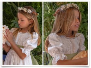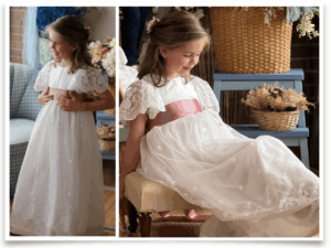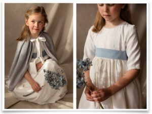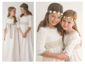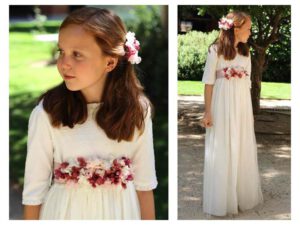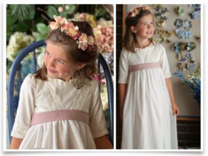 Comunión vestidos sencillos y elegantes para niñas. Complementos y tocados de primera comunión. Coronitas y prendedores de flores. Comunión vestidos y tocados para niña.